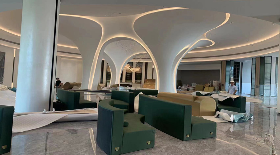 GRG石膏造型的最大魅力在于其幾乎不受限制的可塑性。無論是復雜的曲面、細膩的紋理,還是獨特的幾何形態,GRG都能精準呈現,為室內空間帶來無限創意可能。設計師們通過GRG,可以將天馬行空的想象轉化為觸手可及的現實,創造出既符合功能需求,又富含藝術氣息的空間環境。從天花板到墻面,從燈具到家具,GRG石膏造型無處不在地展現著其作為美學新維度的獨特價值。